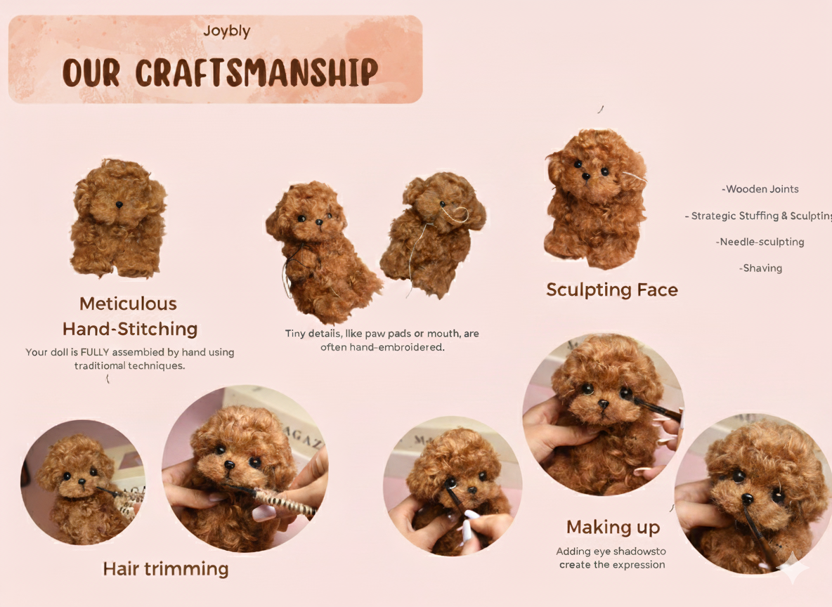 Every step is done by hand — from stitching to final grooming — to ensure your plush is one of a kind.
